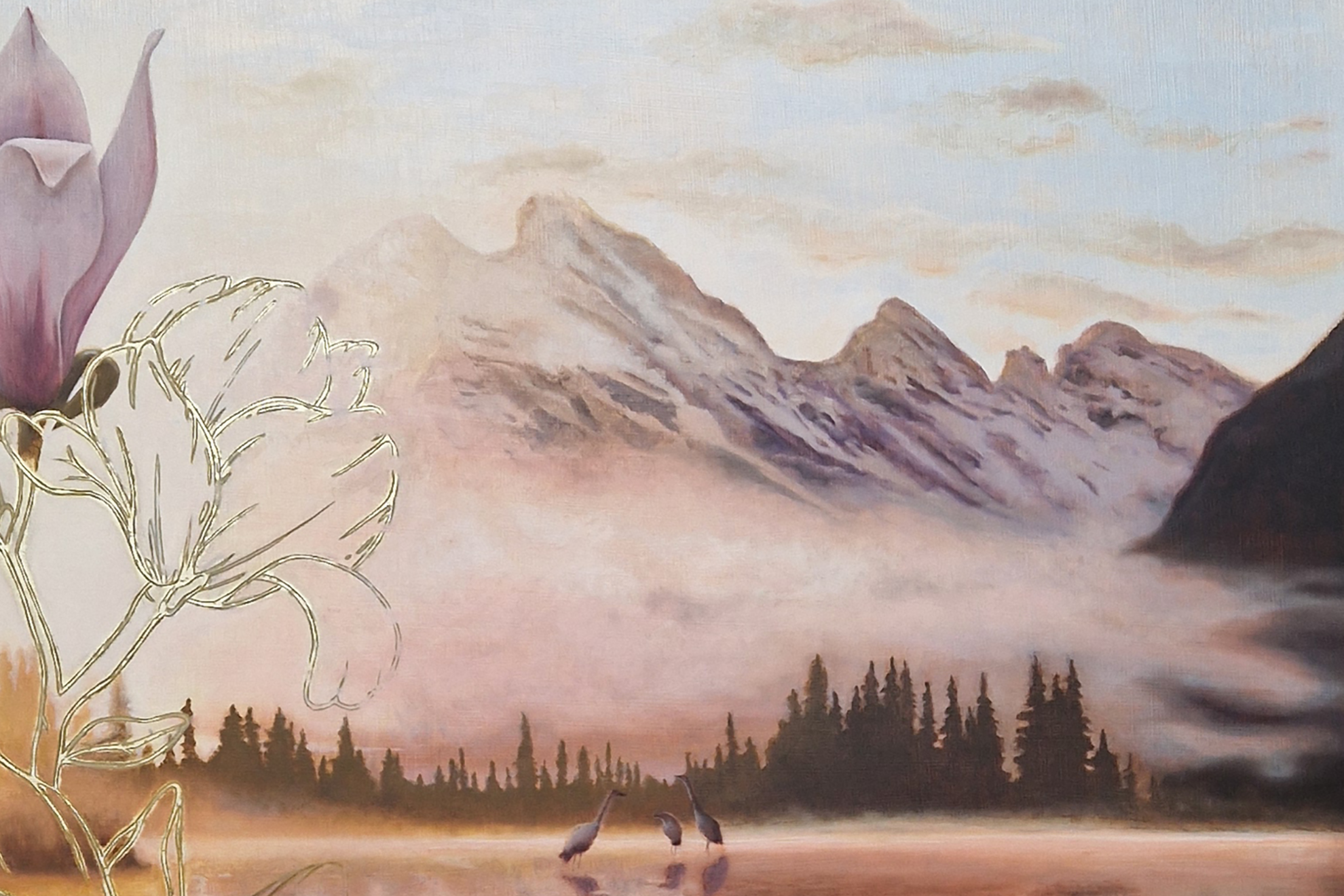 My love for birds, ornaments, details, symbolism and gold show in almost every painting I make. My work is best described as a Magic Realism style of painting.