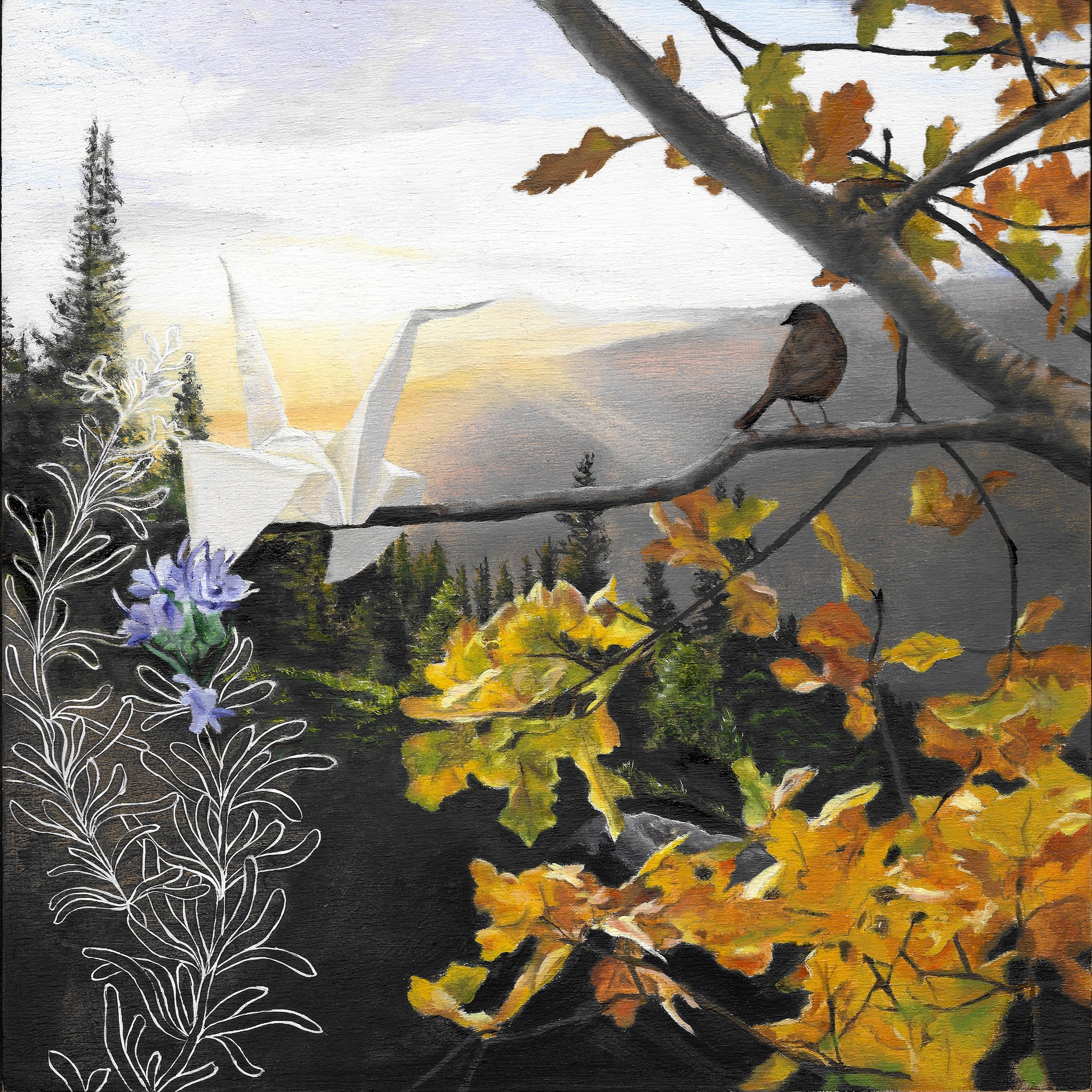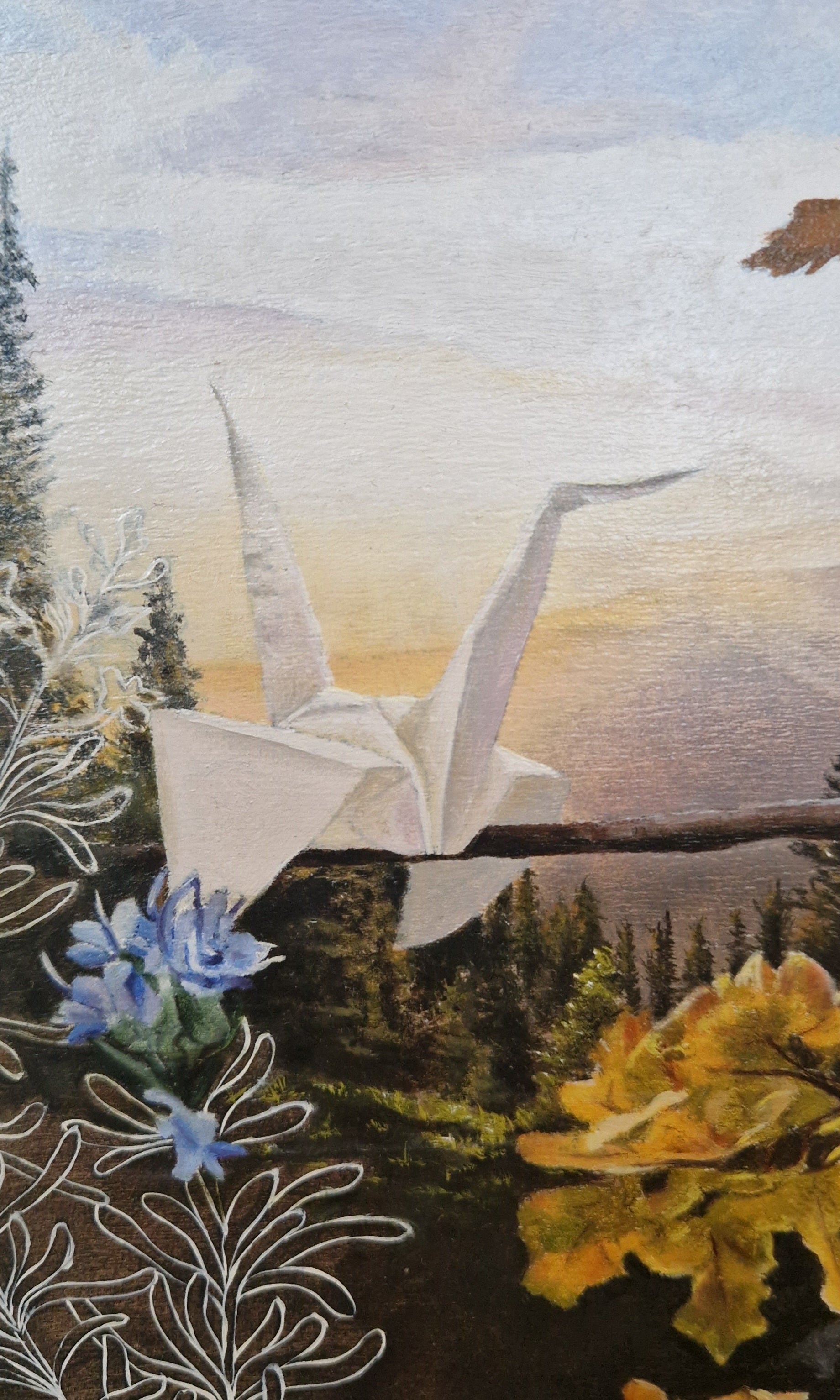 A small paper crane travelling through the world—finding its own path, meeting “real” birds, and moving between the imagined and the fully lived.