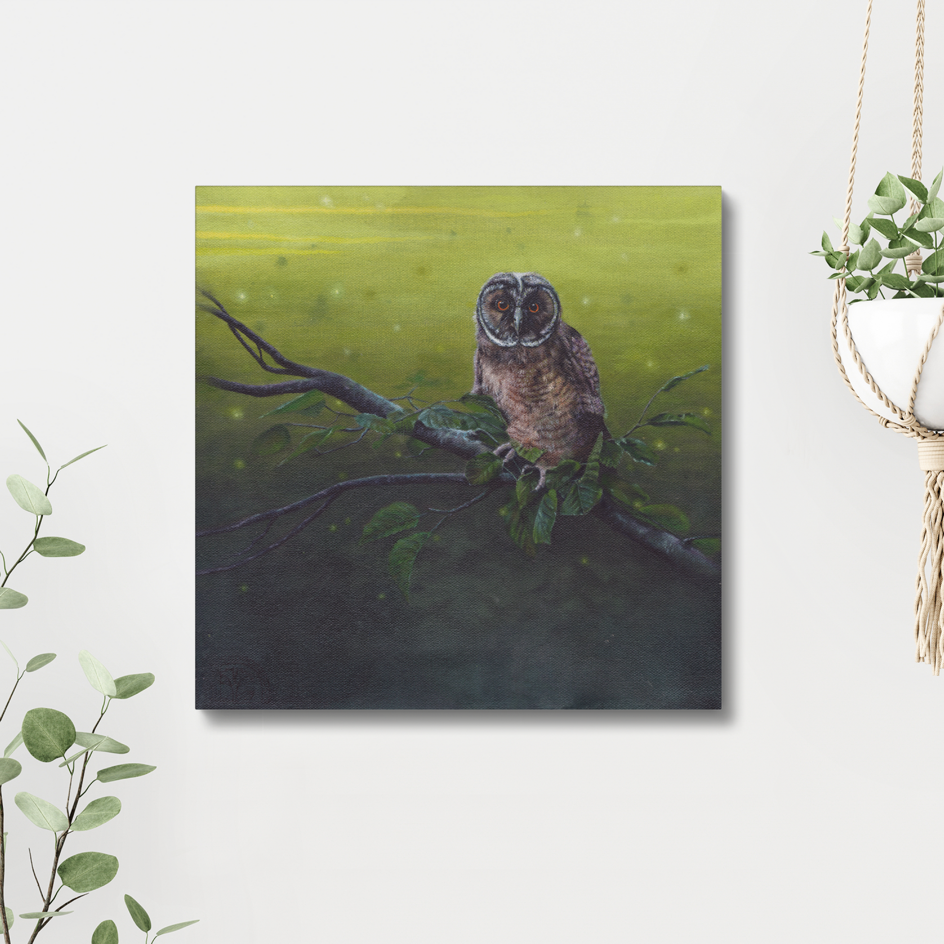 This is the first painting in my "Knowing"-series, which will consist off five bird paintings that together tell a story. This juvenile long eared owl already knows what it's all about!