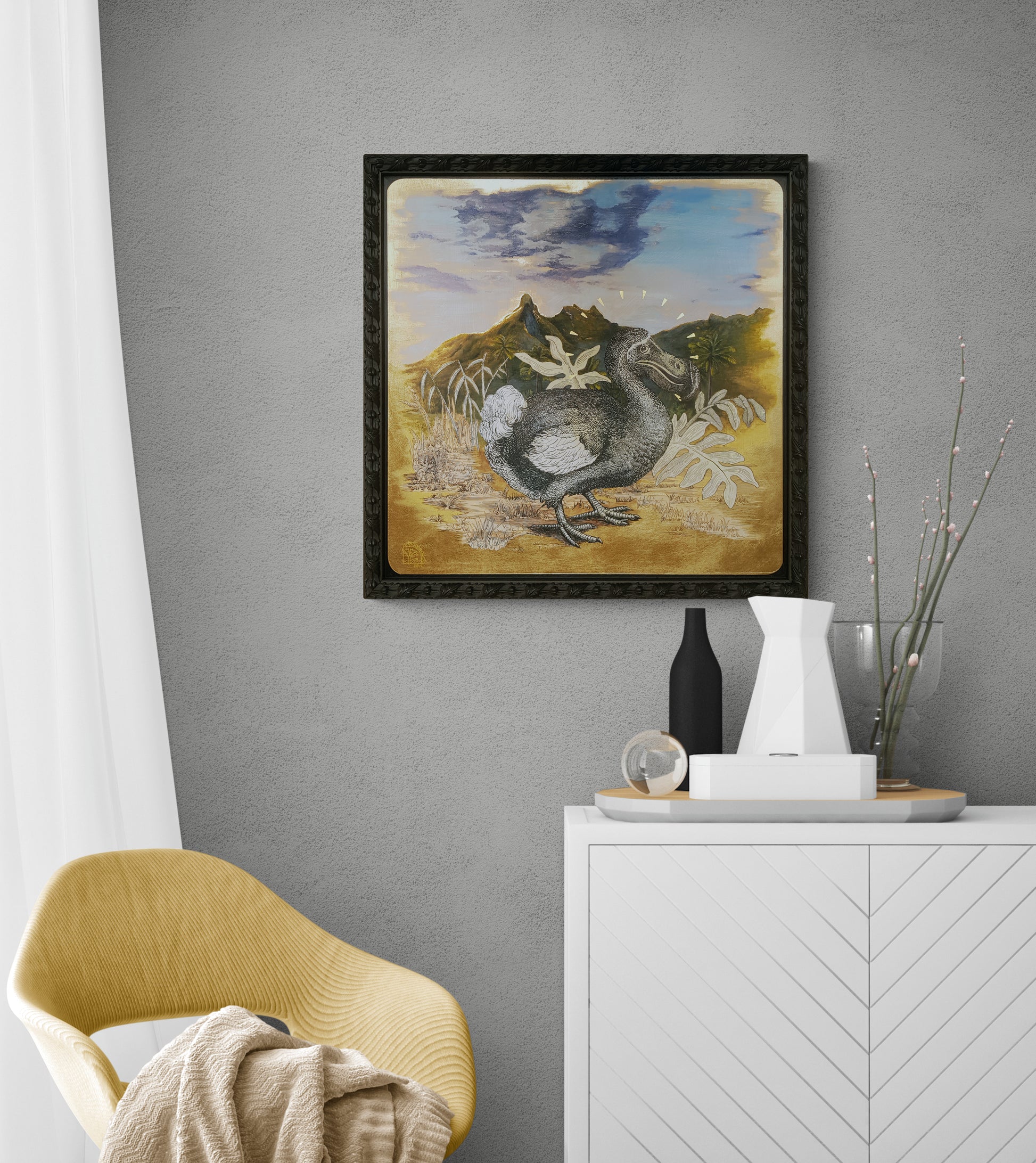 This painting represents one of Mauritius’ splendid mountain ranges with its original inhabitant: the Dodo. While the background is painted in oil paints, the Dodo is made with ink pens, very much like the old illustrations we know of the Dodo. It’s regal halo of 23kt gold gives the Dodo a regal appearance. This painting is meant to evoke a sense of nostalgia and admiration for the extinct species.