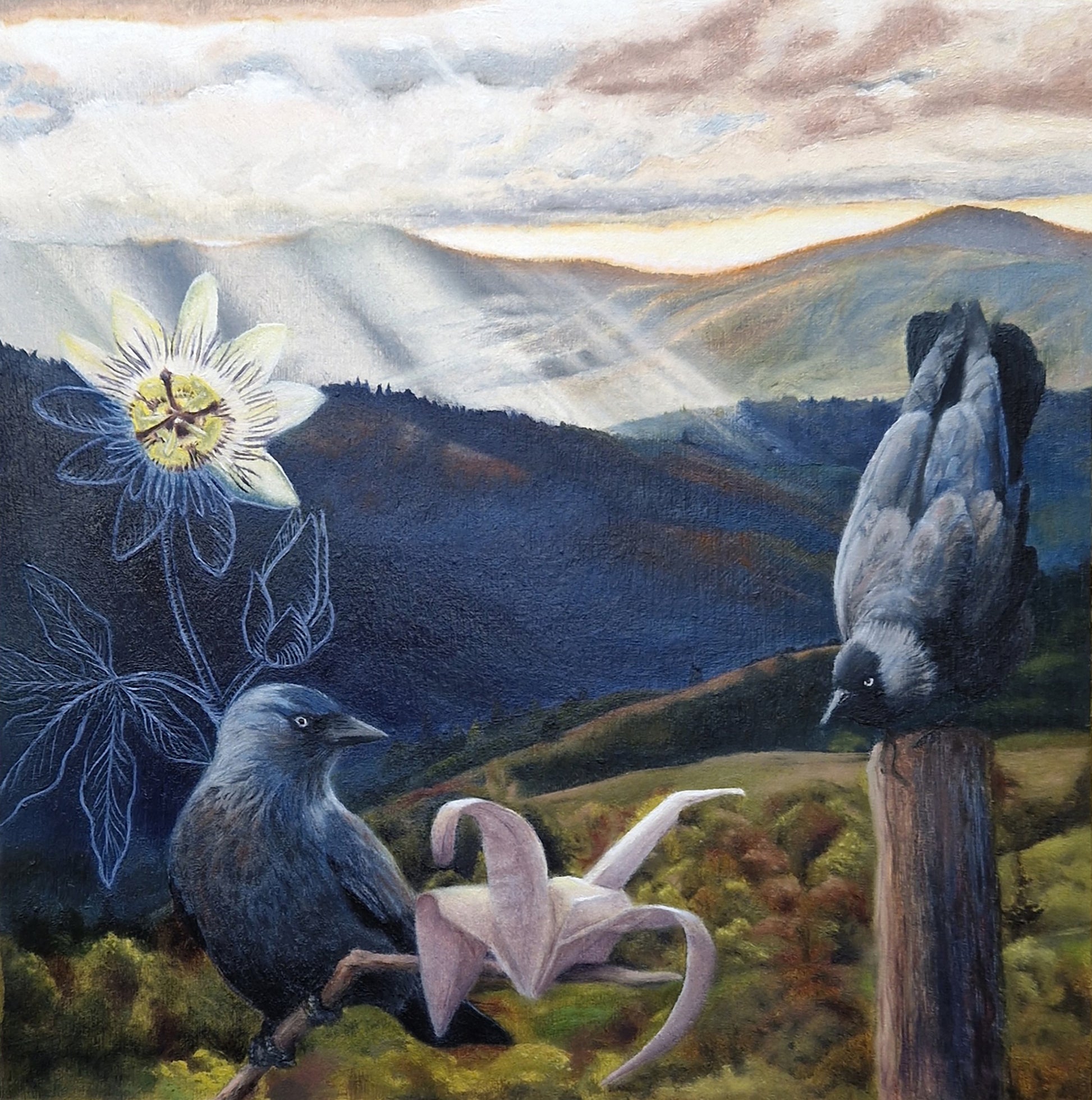 A small paper crane travelling through the world—finding its own path, meeting “real” birds, and moving between the imagined and the fully lived.
